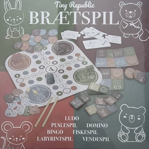 Tiny Republic Brætspil indeholder flere spiltyper som Ludo, puslespil, domino, bingo, fiskespil, labyrintspil og vendespil. Spillet leveres med brikker og spilleplader med forskellige motiver og funktioner. Egnet til børn og familier til underholdning og læring.