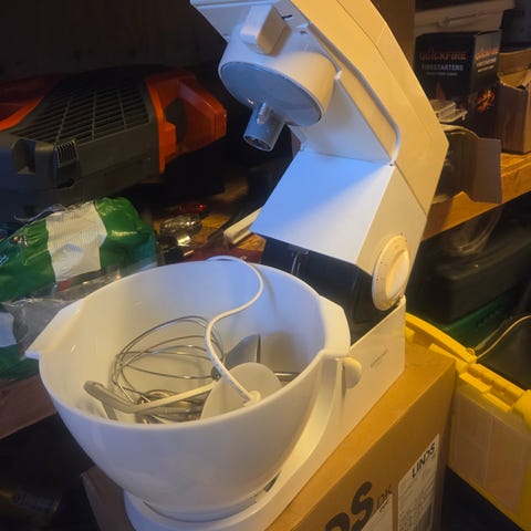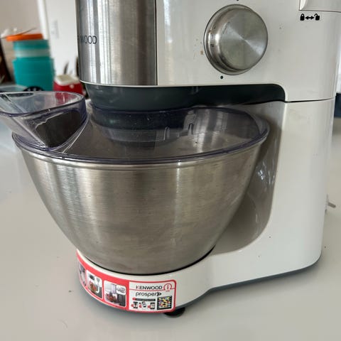 Kenwood KM330 køkkenmaskine i hvid farve. Maskinen har en skål i rustfrit stål og flere tilbehørsdele til forskellige køkkenopgaver. Strømkabel medfølger. Velegnet til blanding, æltning og piskning i hjemmet.