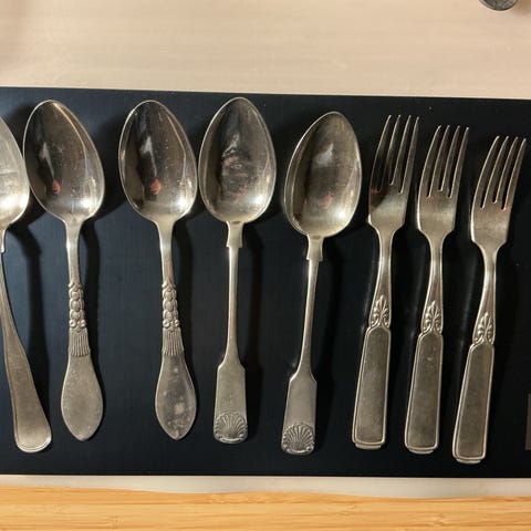 Sæt af antikke sølvbestik dele bestående af skeer og gafler i forskellig størrelse. Bestikket har et klassisk design med patina og tegn på brug. Velegnet til samlere eller til brug ved særlige lejligheder.