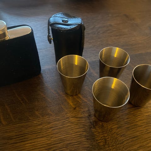 Lommelærke i rustfrit stål med overflade beklædt med lyse og brune læderdetaljer. Designet til bærbar opbevaring af væsker. Kompakt størrelse og skrueprop for sikker lukning.