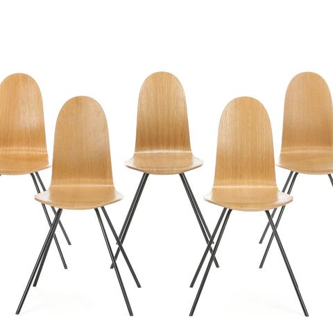 Skaller af formspændt sortlaseret egetræ, ben af sortlakeret stål. Sædehøjde 44 cm.
