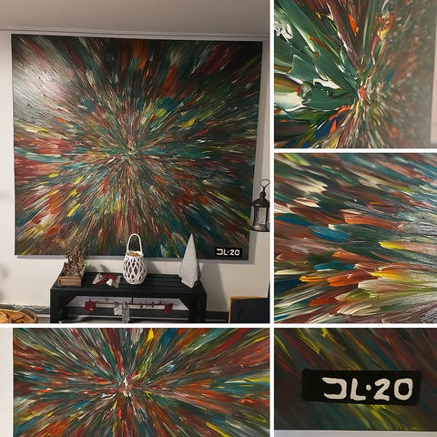 Dit maleri er en ekspressiv abstrakt komposition opbygget af hurtige, flydende penselstrøg, der bevæger sig i forskellige retninger gennem billedfladen. Varme rød- og jordfarvetoner blandes med køligere grønne, blå og grå accenter, hvilket skaber en dynamisk og lagdelt helhed. Malingen er energisk og spontant påført; de krøllede, overlappende linjer skaber en følelse af bevægelse, turbulens og rytme. Værket udstråler intuition og kropslighed, som om kunstneren i et kraftfuldt impuls har oversat sine gestus direkte på lærredet.