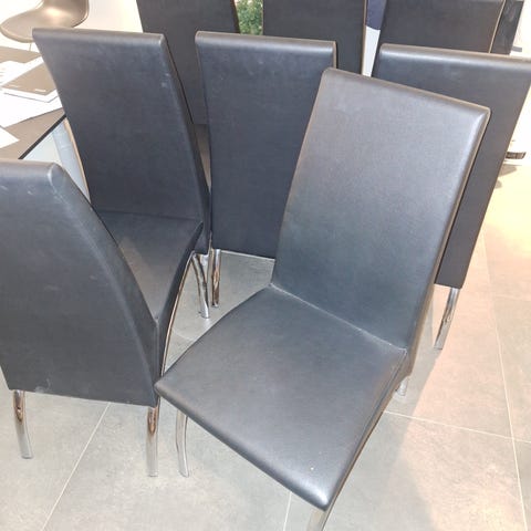 Spisebordsstole i børstet stål, træ og læder. Der er otte styk