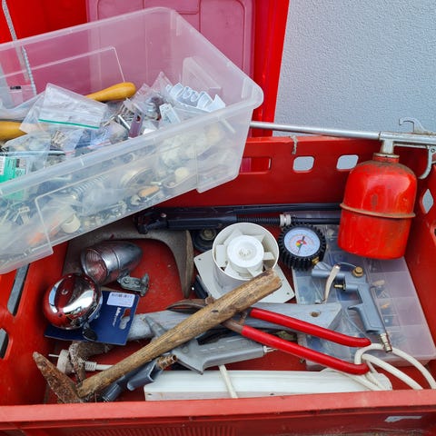Blandet udvalg af værktøj inklusive boremaskiner, save, og håndværktøj samt flere cykler. Produkterne er velegnede til reparation og hobbybrug. Ingen specifikke mærker eller modeller angivet.