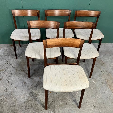 Smukt par Model 39 spisestuestole designet af Henry Rosengren Hansen for Brande Møbelfabrik, Danmark, 1960’erne. Udført i rigt palisander med Rosengren Hansens karakteristiske linjer og præcise samlinger.