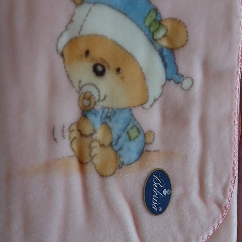 Hjemmestrikket plaid i beige farve. Plaiden har et mønster med huller og er lavet af polyamid 60% og 40 % polyacyl materiale. Den er velegnet til brug som baby tæppe .