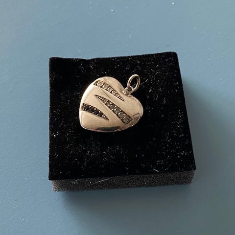 hjertevedhæng fremstillet i sølv, designet til unisex brug. Vedhænget har en poleret overflade og en kompakt størrelse, velegnet til forskellige smykkestilarter. Der er indgraveret et navn, men det er meget utydeligt.