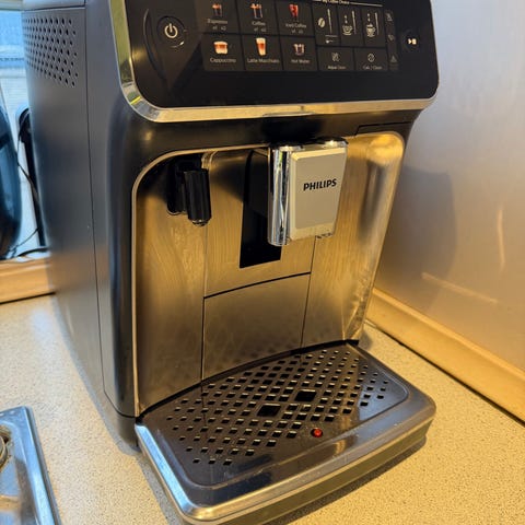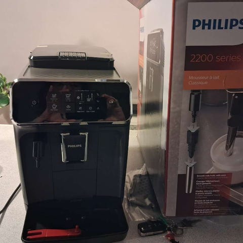 Philips 3200 Series kaffemaskine med integreret mælkeskummer. Maskinen har en sort finish og et brugervenligt touchpanel med forskellige kaffefunktioner. Designet til at brygge flere typer kaffe, herunder espresso og cappuccino. Passer til hjemmebrug og mindre kontorer.