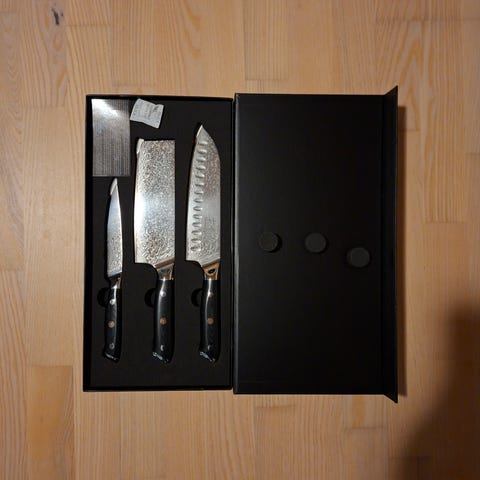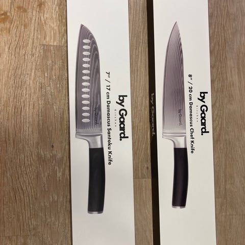 By Gaard Damasus knivsæt med 5 forskellige knive til alsidig brug i køkkenet samt et strygestål.