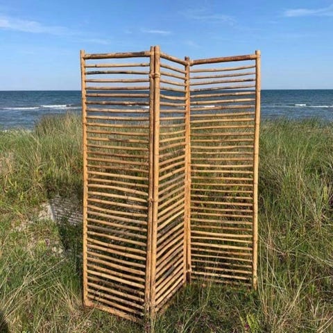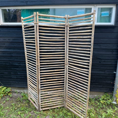 Rigtig fin foldevæg der udslået måler 240 cm x 155 cm. Består af 3 sektioner der kan foldes individuelt. Sammenklappet måler den 80 cm x 6 cm (dybde). Overfladen er beige filt.
