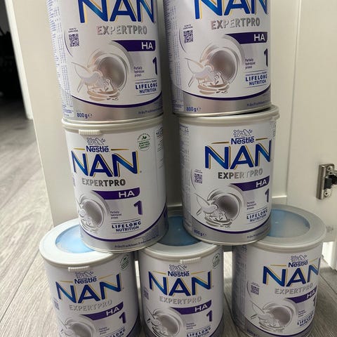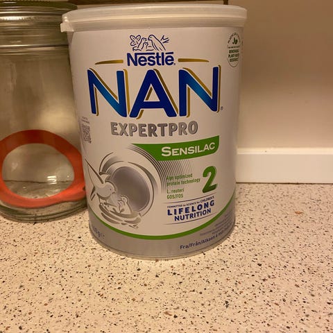 Der er omkring halvdelen tilbage. Eget barn tog ikke imod modermælkserstatning hvorfor den gives væk.