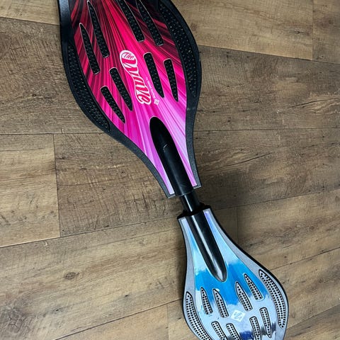 Street Surfing Waveboard med to hjul. Boardet har grønne hjul og en sort base med farverige mønstre på overfladen. Originale waverbord til voksne.