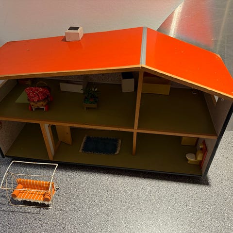 Jeg sælger min barndomsdukkehus. Dukkehuset er fra slut 1960erne. Underetagen er fra begyndelsen af 1970erne.