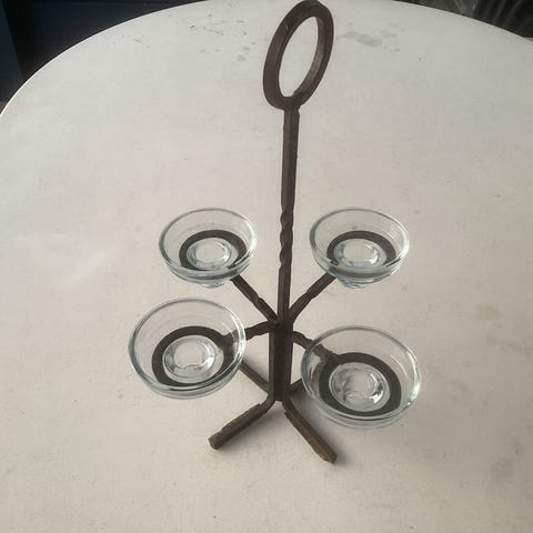 Lysestage, 7 stk. grå lysestager og 1 stk. hvid lysestage i glas til fyrfadslys. Kan stables.