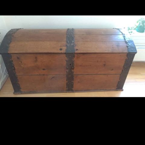 Trækiste med detaljerede messingbeslag og håndtag i siderne. Kisten har en buet top og indvendig opbevaringsplads med en udtrækkelig bakke. Egnet til opbevaring af forskellige genstande og kan fungere som dekorativt møbel.