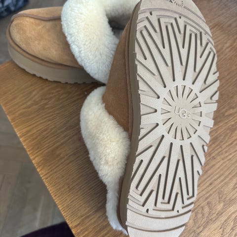 Sutsko lammeskind lammefoer disco emu kilehæl platform plateau slippers slipons Ugg Australia homeshoes pride