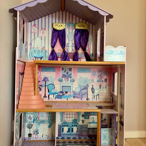 Barbie dukkehus i tre etager med møbler og tilbehør. Dukkehuset har rosa vægge med dekorationer og inkluderer forskellige møbler som sofa, bord og stole. Velegnet til børn til leg og indretning.