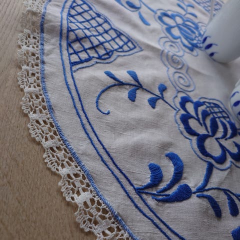 Blå dug vintage. God til dit musselmalede porcelæn