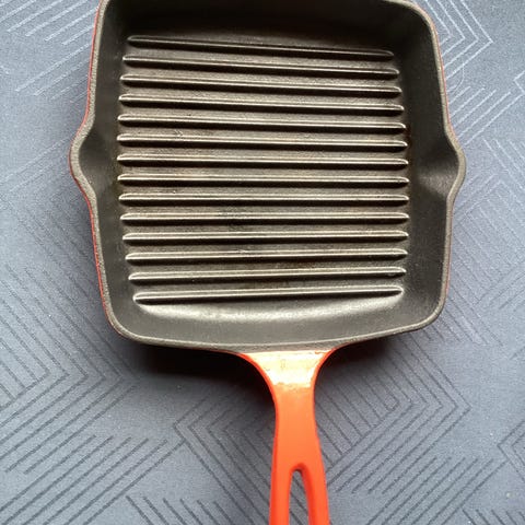 En Tefal grillpande med riller og Thermo-Spot, som indikerer, når den har opnået den rette stegetemperatur, er tilgængelig. Den er også kompatibel med induktionskomfurer. Panden er kun blevet opvarmet.