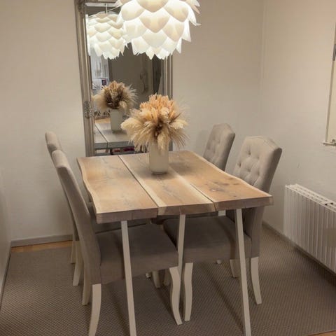 Smukt og unikt hjemmelavet plankebord lavet af to solide egetræsplanker, der giver bordet et naturligt og eksklusivt udtryk. Bordpladen har flotte årer, små knaster og en let rå kant, som giver masser af karakter.