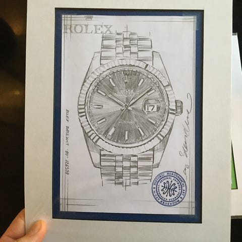 Billedet viser den legendariske Rolex Submariner 116610 LV også kaldet "HULK" pga den grønne farve på både lunette og skiven. Grundet det grønne tema er den originale kunst-illustration opklæbet på grøn baggrund.