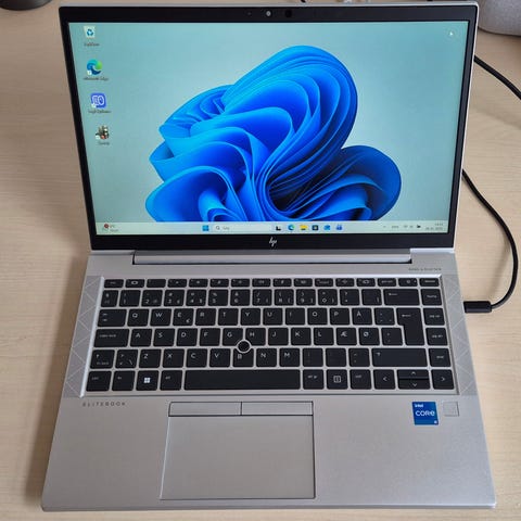 HP EliteBook 840 G3 laptop med Intel Core i5-6300U processor, 8 GB RAM, 256 GB SSD lagerplads og 14-tommer skærm. En bærbar computer velegnet til arbejde og daglig brug. den leveres med en oplader