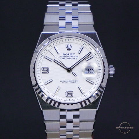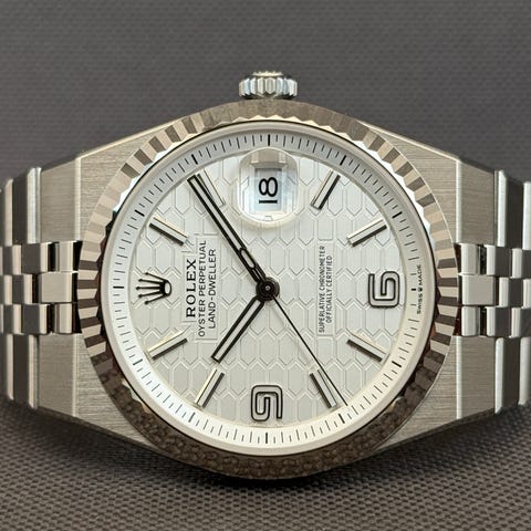 Den nye og populære Rolex Land-Dweller i 40 mm som er den nyeste model i Rolex’ lineup. Uret kommer med Jubilee-lænke, riflet hvidguldskrans og den nye, karakteristiske hvide honeycomb-skive. Gennem den gennemsigtige safirbagkasse kan man nyde det nye Calibre 7135, som yder 66 timers gangreserve og vand tæthed ned til 100 meter.