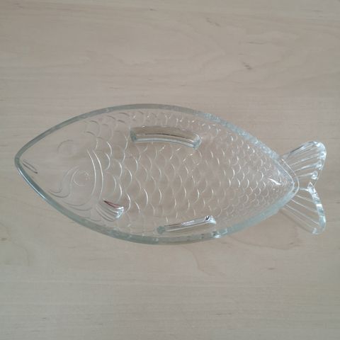 Glas, Fiskefad, Fiskeanretning, Fad formet som en fisk. Udført i kraftigt glas og kunne næsten se ud som om det kan komme i ovnen. Er dog ikke sikker så nok bedst bare at bruge det til anretning.
