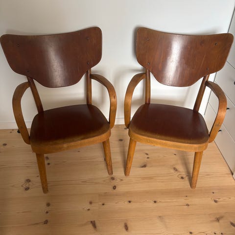 Dette sjældne par danske moderne lænestole, designet i 1930'erne af arkitekt Magnus Læssøe Stephensen for den anerkendte møbelsnedker Fritz Hansen, eksemplificerer den innovative ånd i tidlig dansk modernisme. Lænestolene er fremstillet af bøjet bøgetræ og kombinerer Stephensens arkitektoniske præcision med Fritz Hansens berømte håndværk, hvilket resulterer i møbler, der er både elegante og holdbare. De originale hynder er blevet ompolstret med ren vegatal læder der patinere smukt med tiden. Stolene er udgået fra Møbelsnedker Asbjørn Møbler i Skindergade 28-32 i København i 1930erne. Mulighed for levering i Kbh.
