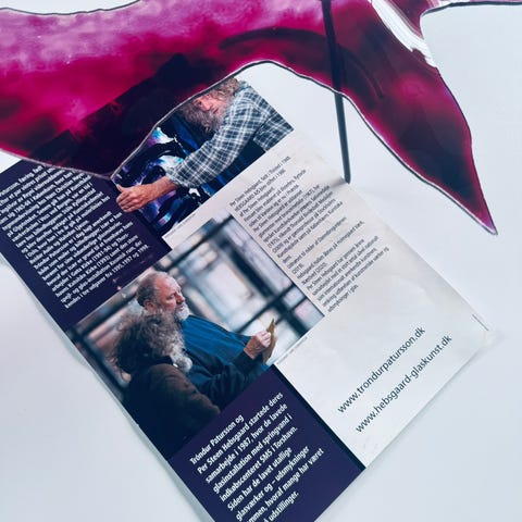 Dekorativ fugl skulptur i glasl med rødbrune og hvide farvetoner. Skulpturen er monteret på en rund metalbase, hvilket gør den velegnet som borddekoration men kan også hænges op.