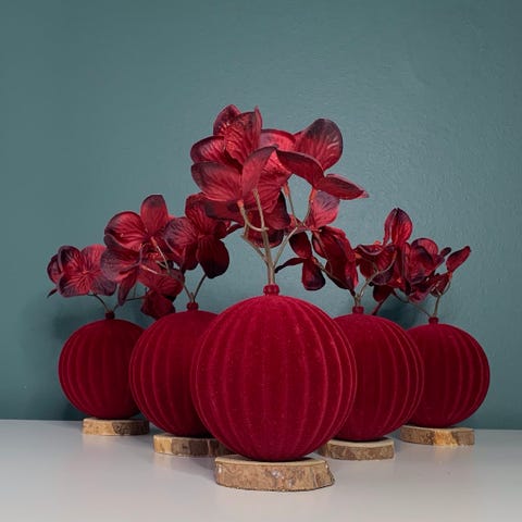 Fler-årig borddekoration til fx. julebordet. Bordeaux/mørkerød julekugle med tern i vintage look på træfod. Den er pyntet med kunstige blomster, der holder i mange år. Du kan købe den med og uden blomster. Kuglen er malet glas, så små “slaghuller” skal forventes i farven. Personligt synes jeg bare, at det er en slags patina i vintage looket.