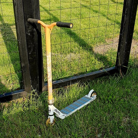 Løbehjul med sort stel og hjul. Håndtag har brune greb. Designet til tricks.