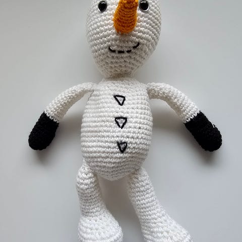 Sød snemand bamse med rød nissehue og rødt halstørklæde. Gulerodsnæse og store øjne.