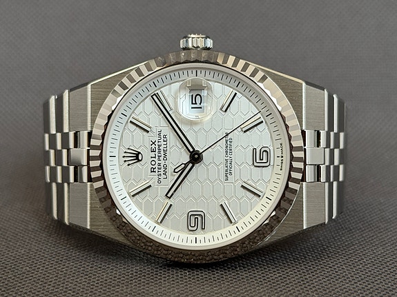 Smukt Rolex Oyster Perpetual i 41mm med den populære grønne skive. Låsen er med easylink som kan justeret med 5mm for ekstra komfort. Inde i uret sidder Rolex nye Calibre 3230 som yder 70 timers gangreserve og vandtæthed til 100 meter.