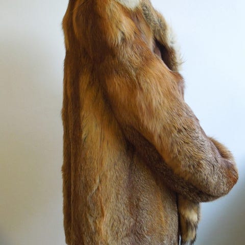 Unik pels i rød lam, og af krave og ærmer i rævepels. Rinsten, lynlås og i virkelig god stand. Købte den brugt men den havde vidst aldrig været brugt, og jeg har også kun brugt den meget få gange.