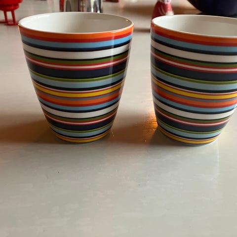 iittala kop uden hank med stribet mønster i forskellige farver. Koppen er 9cm høj og har en diameter øverst på 8cm.