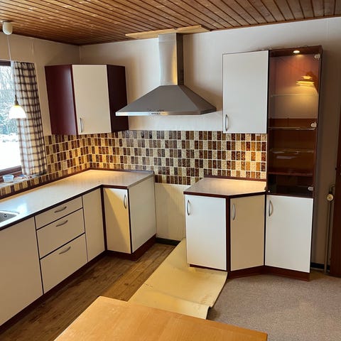 Komfur, emhætte, køleskab, vask og blandingsbatteri følger med.