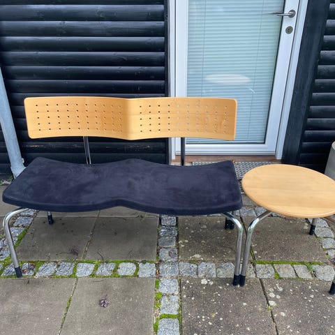 Design af Rud Thygesen og Johnny Sørensen💙1 stk. to-pers. bænk, model Sea🌊 Stel af sortlakeret stål, sæde betrukket med koboltblåt møbelstof. Fremstillet ved Magnus Olesen 〰️ pris for bænken er 1200,-