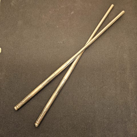 Et par meget fine spisepinde. Cloisonne agtig skaft med blomstermønster og i en fin stofbeklædt æske. Har aldrig været brugt. En pind måler ca 22cm.