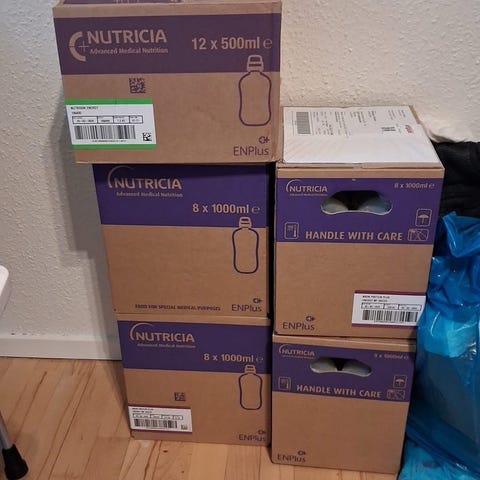 Nutrison Protein Plus ernæring med energiindhold på 1,25 kcal/ml. Produktet leveres i 28 flasker a' 1 Liter og 5 flasker a' 0,5 Liter. Inkluderer 40 Amika ernæringssæt.