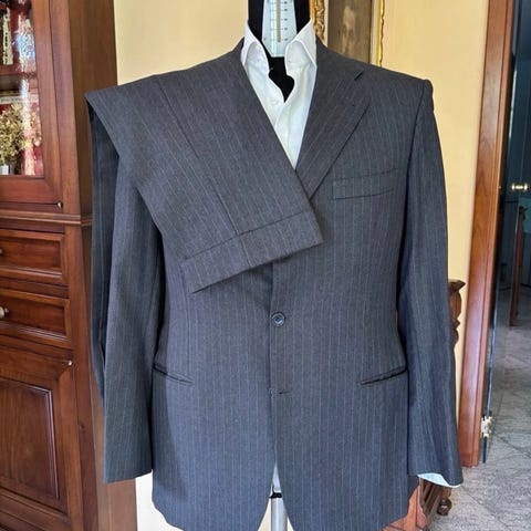 Det er et smukt gråt sæt i 100% uld med viskosefor, uden mønster, og med en jakke der har en lidt bredere revers end normalt.