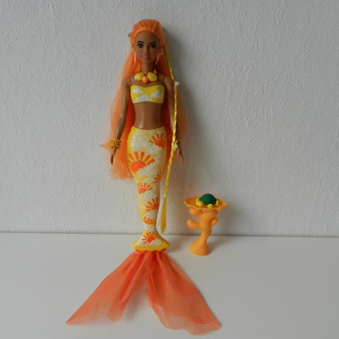 Barbie Havfrue dukke med farverigt tøj og tilbehør, herunder delfin, spækhugger, hat, dykker sæt og diverse små dele. Dukken har langt hår og er designet til leg og samling.