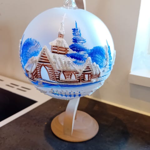 Stor kobberfarvet julekugle med et patineret/reflekterende udseende.
