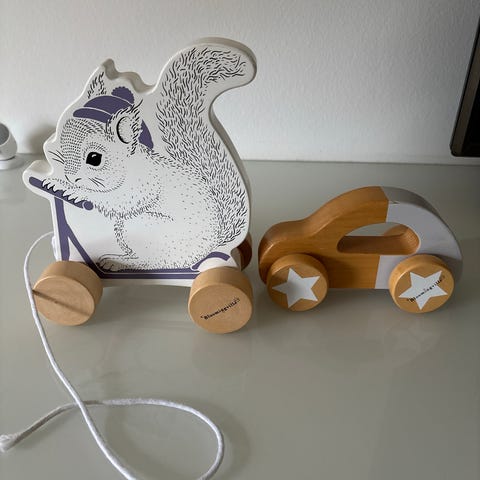 Kanin trækdyr i træ med rødmalede hjul og blå snor til at trække med.