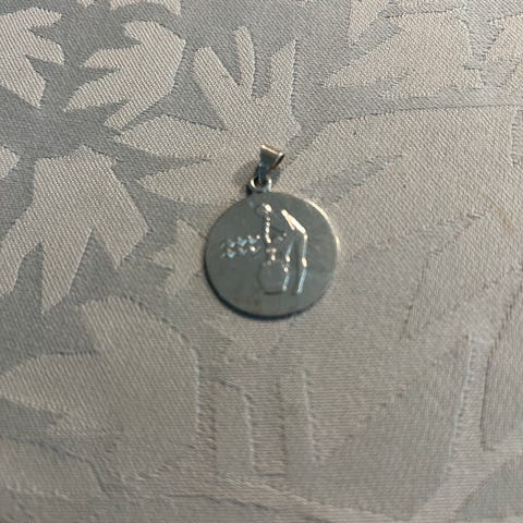 Løvens tegn i sølv måler D: 1.5 cm og fiskene med sølvstempel måler 12 x 30 mm