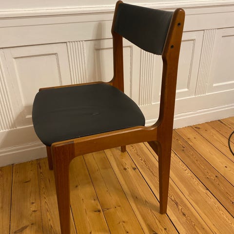 3 stole i teak med flet sæde. Fine detaljer. Slidt med Synlige brugsspor. Løse i alle samlinger. En pind knække og forsøgt limet. Pris pr stk