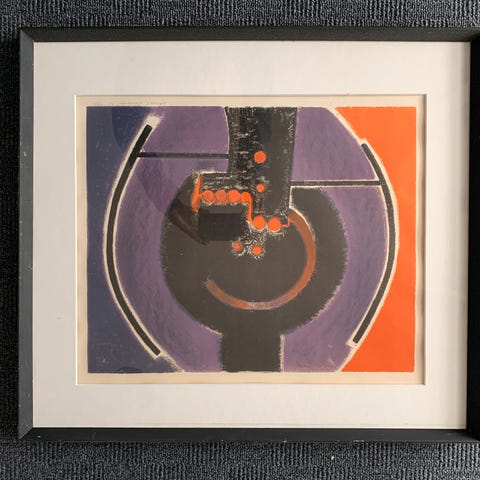 Arne L. Hansen litografi med abstrakt motiv i røde og orange nuancer. Signeret og nummereret 276/310.