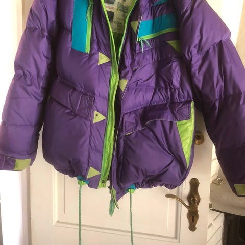 Lækker dunjakke fra 90`erne fremstår som ny og ubrugt virkelig et lækkert vintage fund. Jakken er en M-L og er med dun i