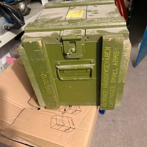 US Army metal opbevaringskasser i grøn farve, designet til robust opbevaring og transport. Kasserne har håndtag til nem håndtering og er velegnede til opbevaring af værktøj, dele eller andre genstande.
