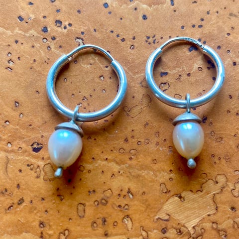 Creme hvide ferskvands perle øreringe. Forgyldt sterling sølv. Nye og ubrugte. Perlen måler 1cm x 1,2cm. Øreringen måler 2,4cm x 1cm. Stemplet 925. Dansk Håndværk.